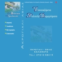 Πολυτελή ενοικιαζόμενα διαμερίσματα στο Ακρογιάλι Αβίας, Καλαμάτα. Πλήρως ανακαινισμένα έτοιμα να φιλοξενήσουν οικογένειες 3,4 αλλά και 6 ατόμων χαρίζοντας την άνεση χώρου (45-60 τ.μ.) αλλά και την πολυτέλεια των ξενοδοχειακών υπηρεσιών που προσφέρουμε. Προσθήκη στο Vres.gr: 2008-12-08 09:49:09 URL: http://www.moireaskalamata.gr
