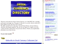 Ο σκοπός αυτής της σελίδας είναι να εφοδιάσει τους συλλέκτες με μια λίστα από ελληνικά νομίσματα του 1828 έως και σήμερα. Προσθήκη στο Vres.gr: 2007-12-03 10:11:12 URL: http://www.geocities.com/colosseum/4340/greek-currency/