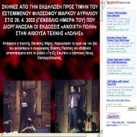 Η εκδήλωση προς τιμήν του εστεμμένου φιλοσόφου Μάρκου Αυρηλίου που διοργάνωσαν οι εκδόσεις 'Ανοιχτή Πόλη' στην αίθουσα τέχνης 'Λόλης'. Προσθήκη στο Vres.gr: 2007-12-03 10:11:12 URL: http://www.geocities.com/anichtipoli/AUREL.html